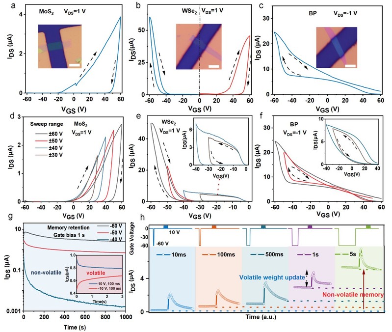 3.极性依赖的二维异质结铁电晶体管验证:实验制备了三种二维异质结铁电晶体管,分别采用 n型MoS2、p型BP和双极性WSe2作为沟道层。结果显示:MoS₂器件呈现CT主导的迟滞曲线;BP器件呈现FE主导的迟滞曲线;WSe₂器件在同一器件中实现FE与CT的双模共存,展现出由极性驱动的异质调控效应。其中,WSe₂器件在p型区迁移率高达 195 cm² V⁻¹ s⁻¹,开关比超过 3×10⁶,性能位列同类铁电晶体管前列。